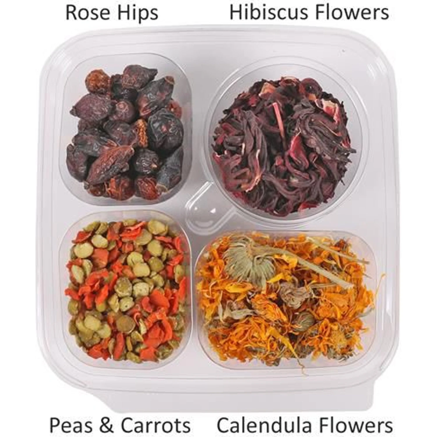 - Includes 4 tasty flavors of rose hips, veggies, calendula flowers and hibiscus flowers.