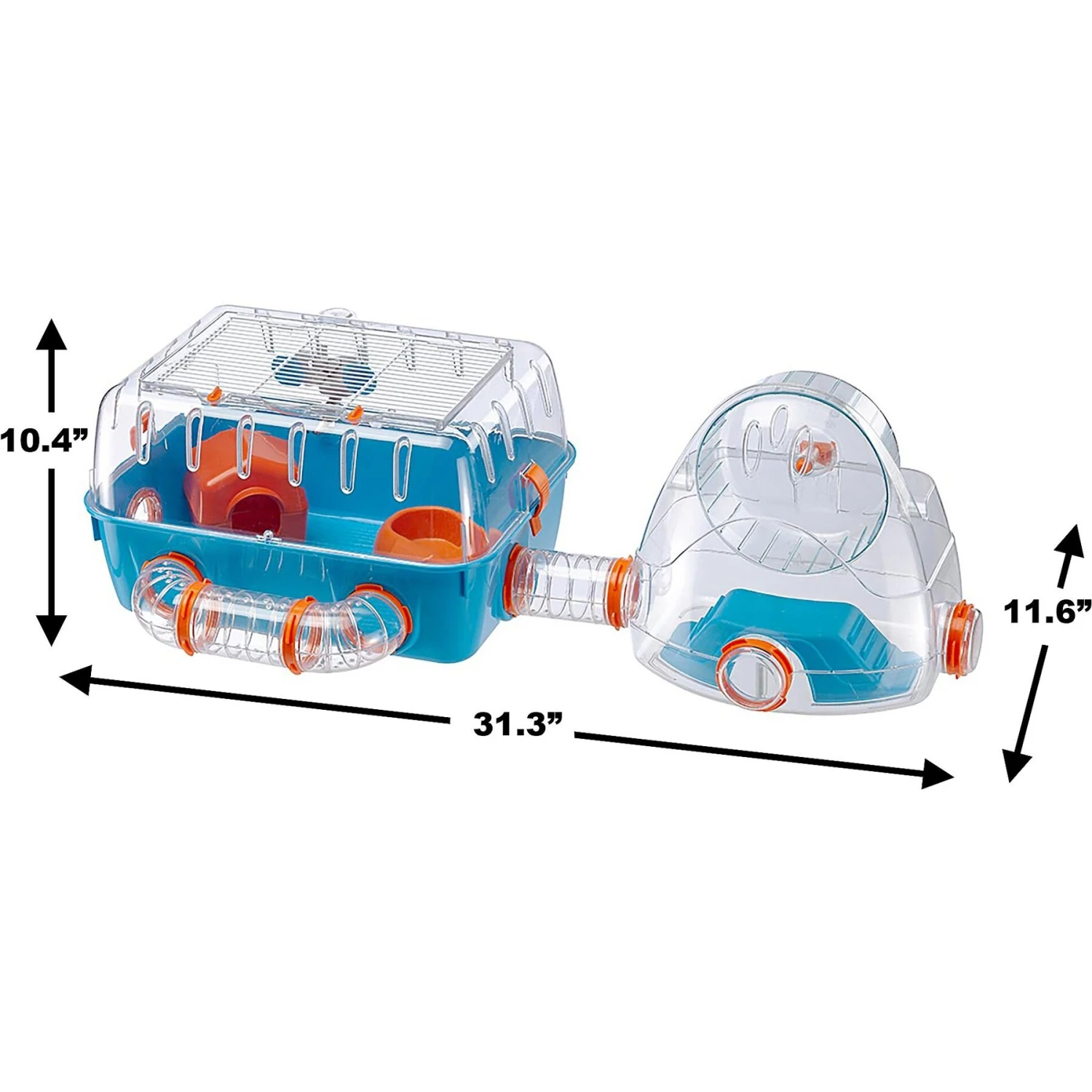 - This modular cage is designed so you can interact with your hamster more often, with a separate living and play area, connected by a clear play tube.