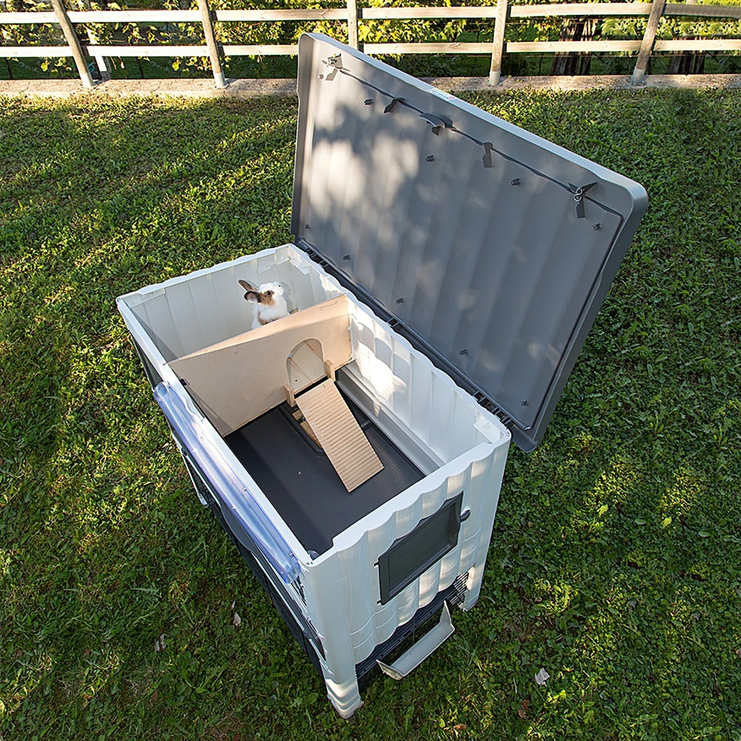 - Includes needed accessories for an outdoor bunny home—a large water bottle, hay feeder, wooden ramps and wood hutch.