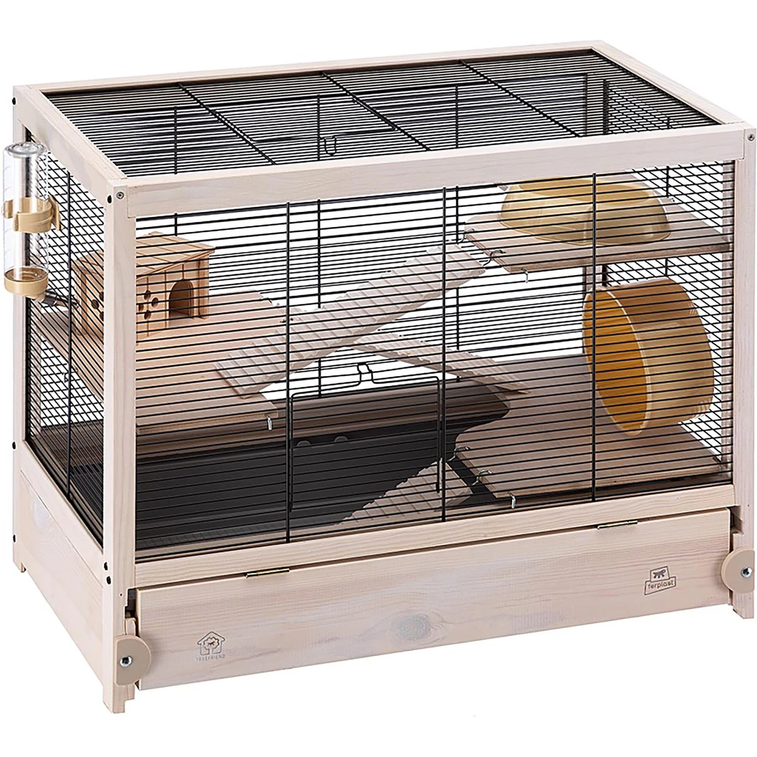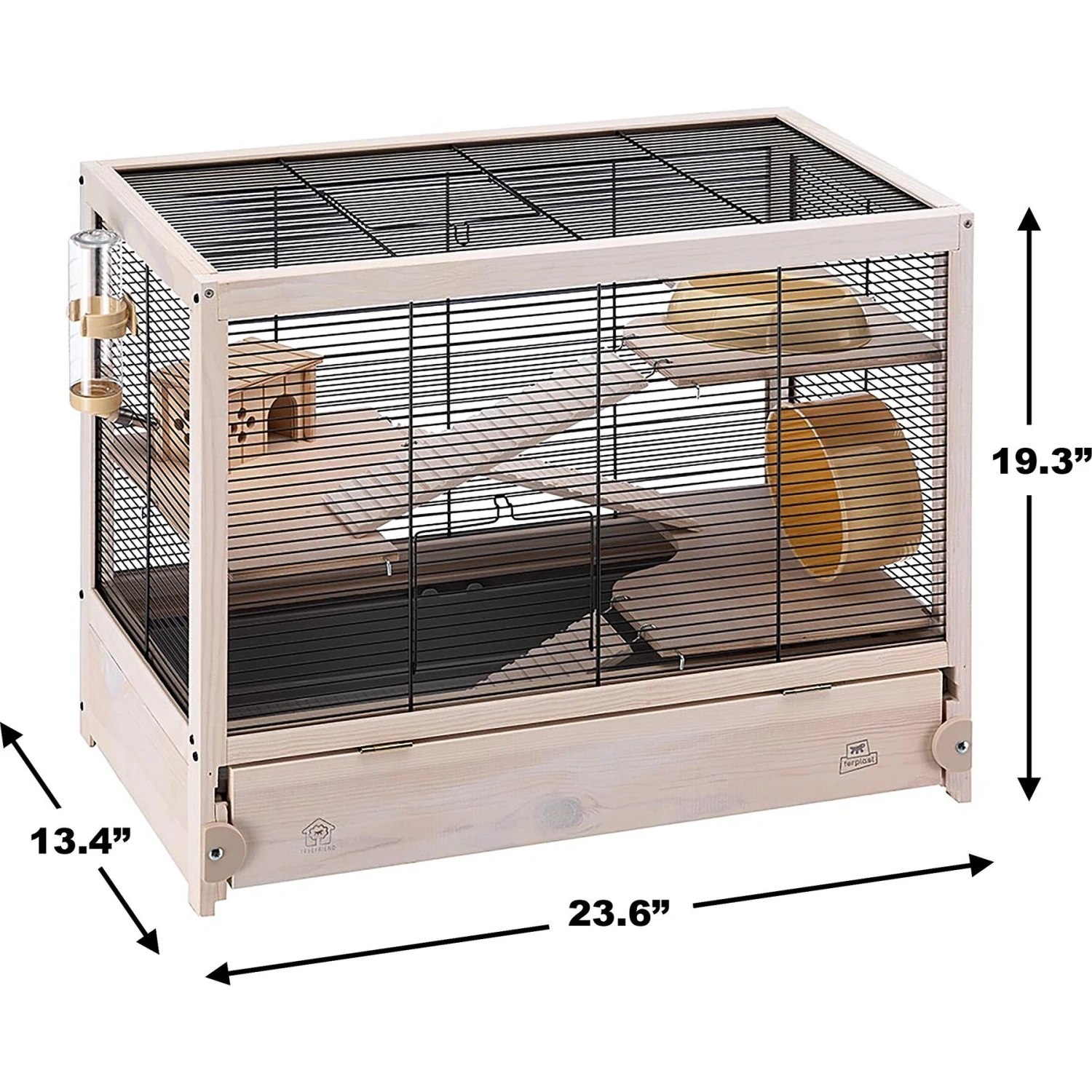- Includes a water bottle, food dish, exercise wheel, hamster hideout, 3 wooden platforms and ladders—making it a perfect starter cage for your hamster pal.