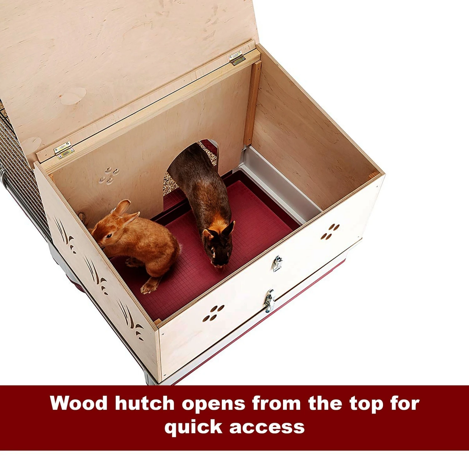 - The wood hutch extension comes with a full top door equipped with a lock, as well as a private living and nesting space for your furry friend.