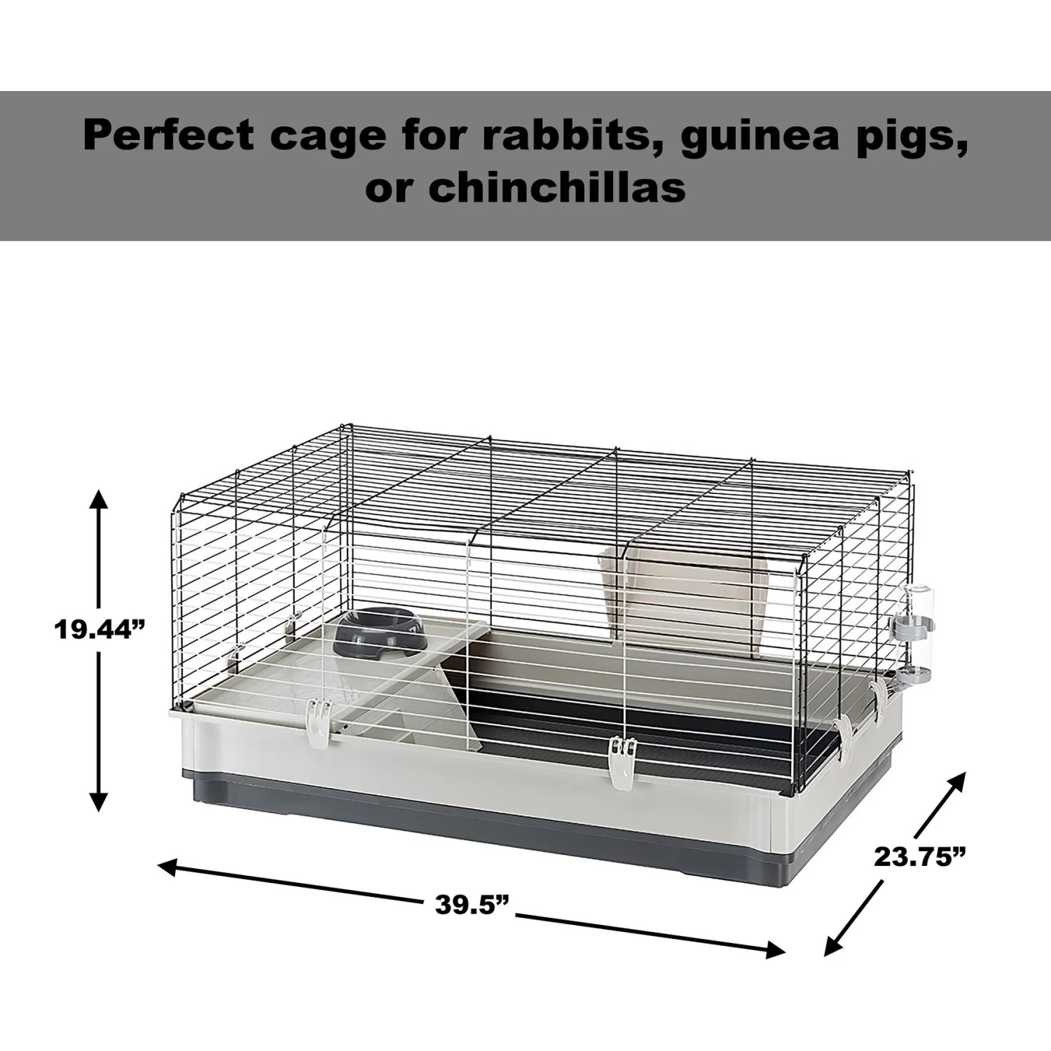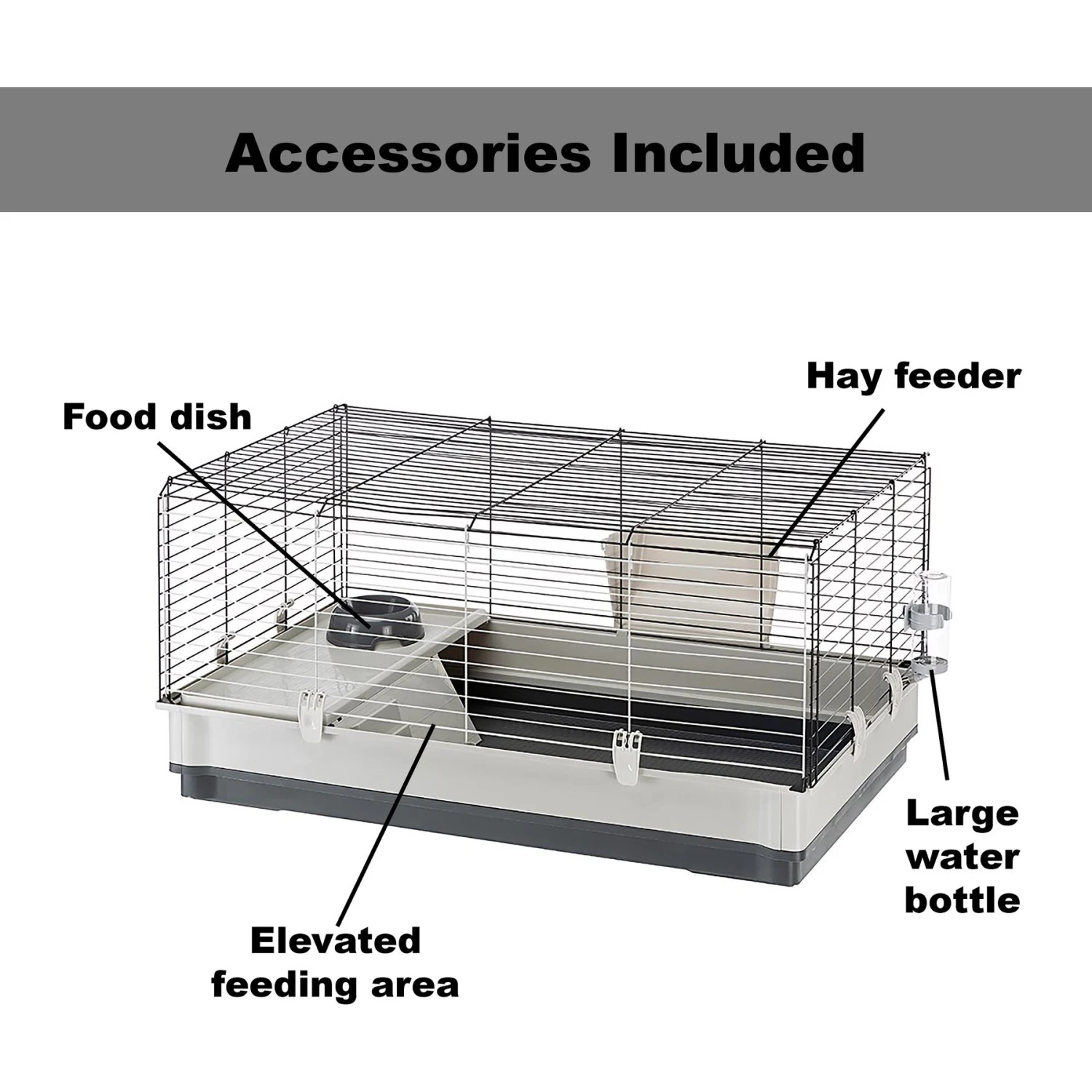 - This deluxe cage includes a large water bottle, hay feeder, feeding bowl and elevated feeding area—the accessories you need for your rabbit, chinchilla or guinea pig’s home.