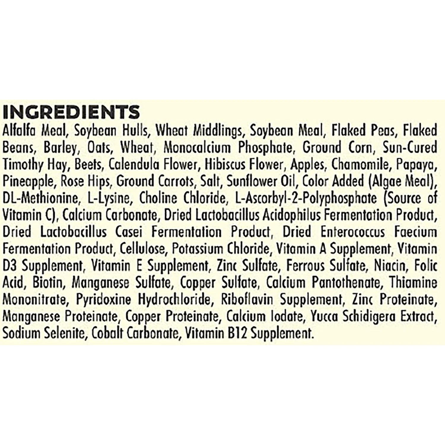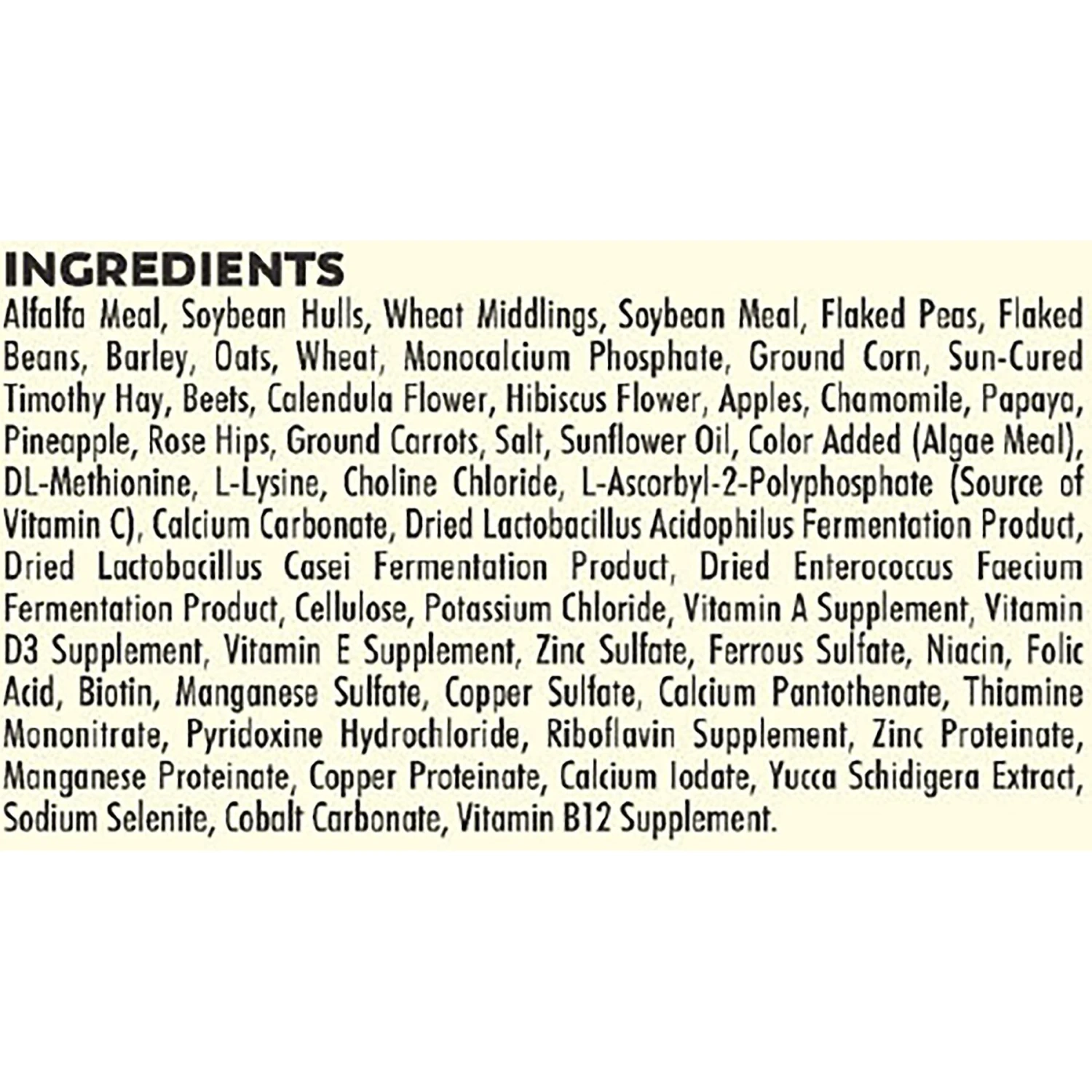- A healthy, all-natural blend of species-appropriate dried mixed fruits, sun-cured hay, flaked vegetables and pre-cooked legumes.