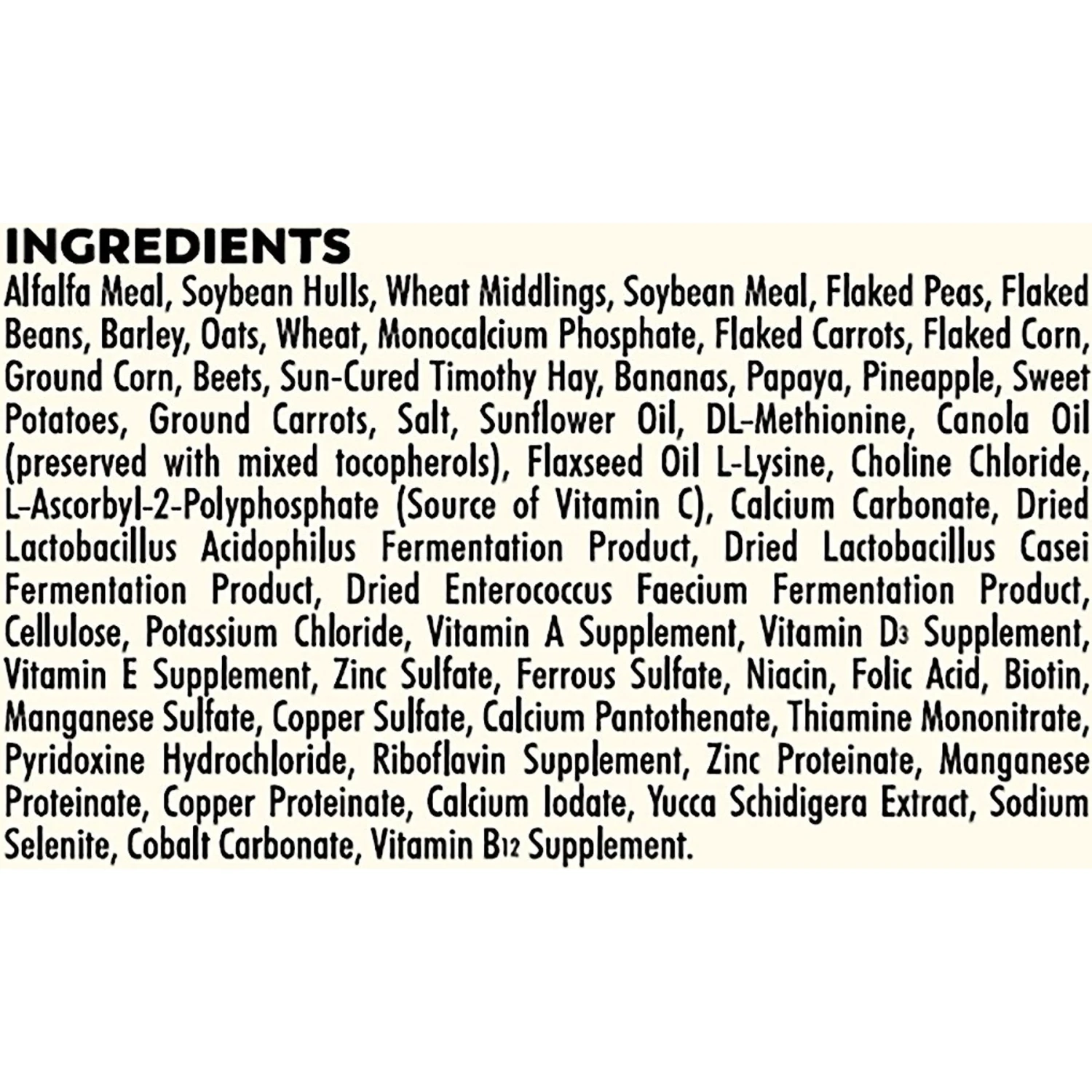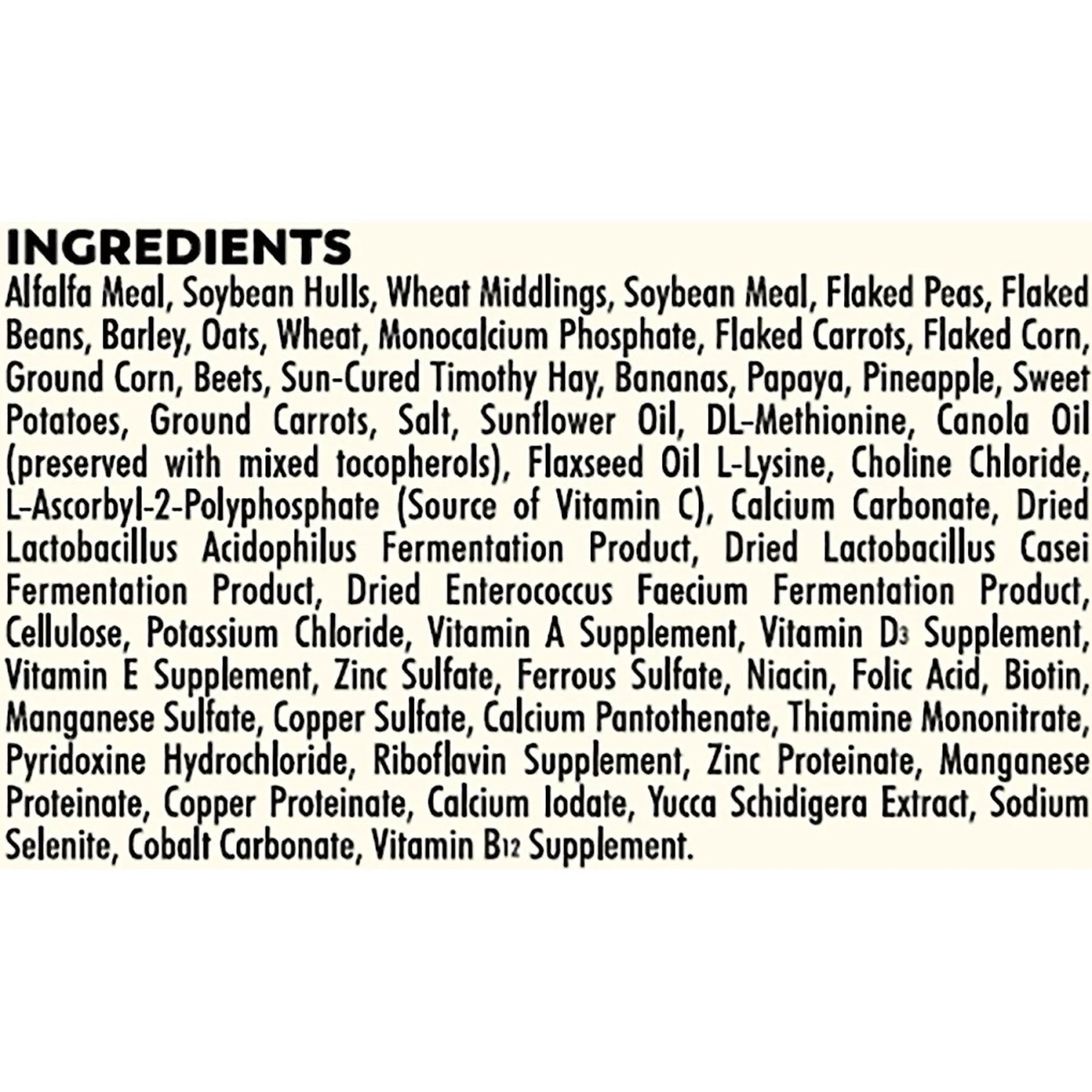 - A healthy, all-natural blend of species-appropriate dried mixed fruits, sun-cured hays, vegetables and pre-cooked legumes.