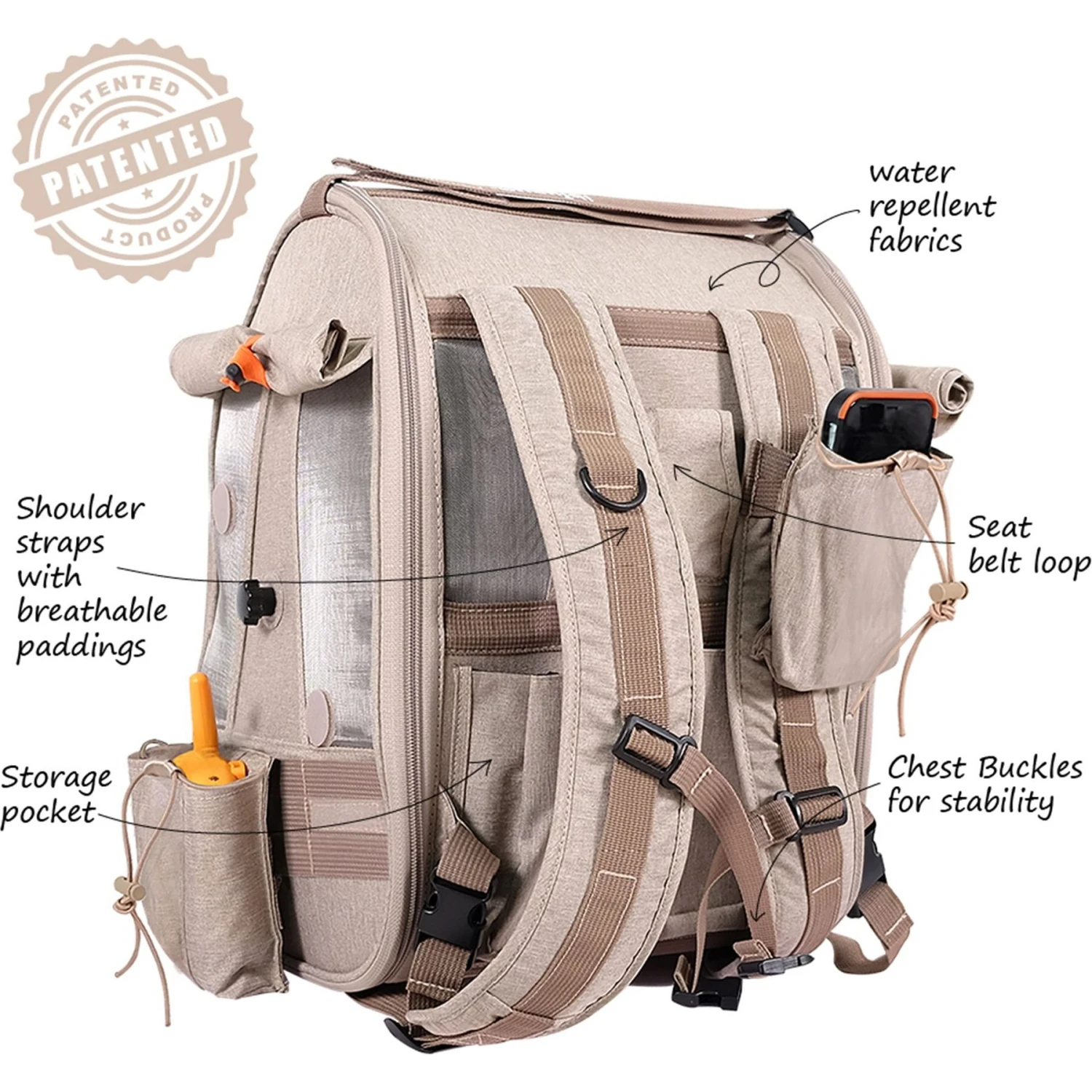 - Movable storage pouches can store your essentials.