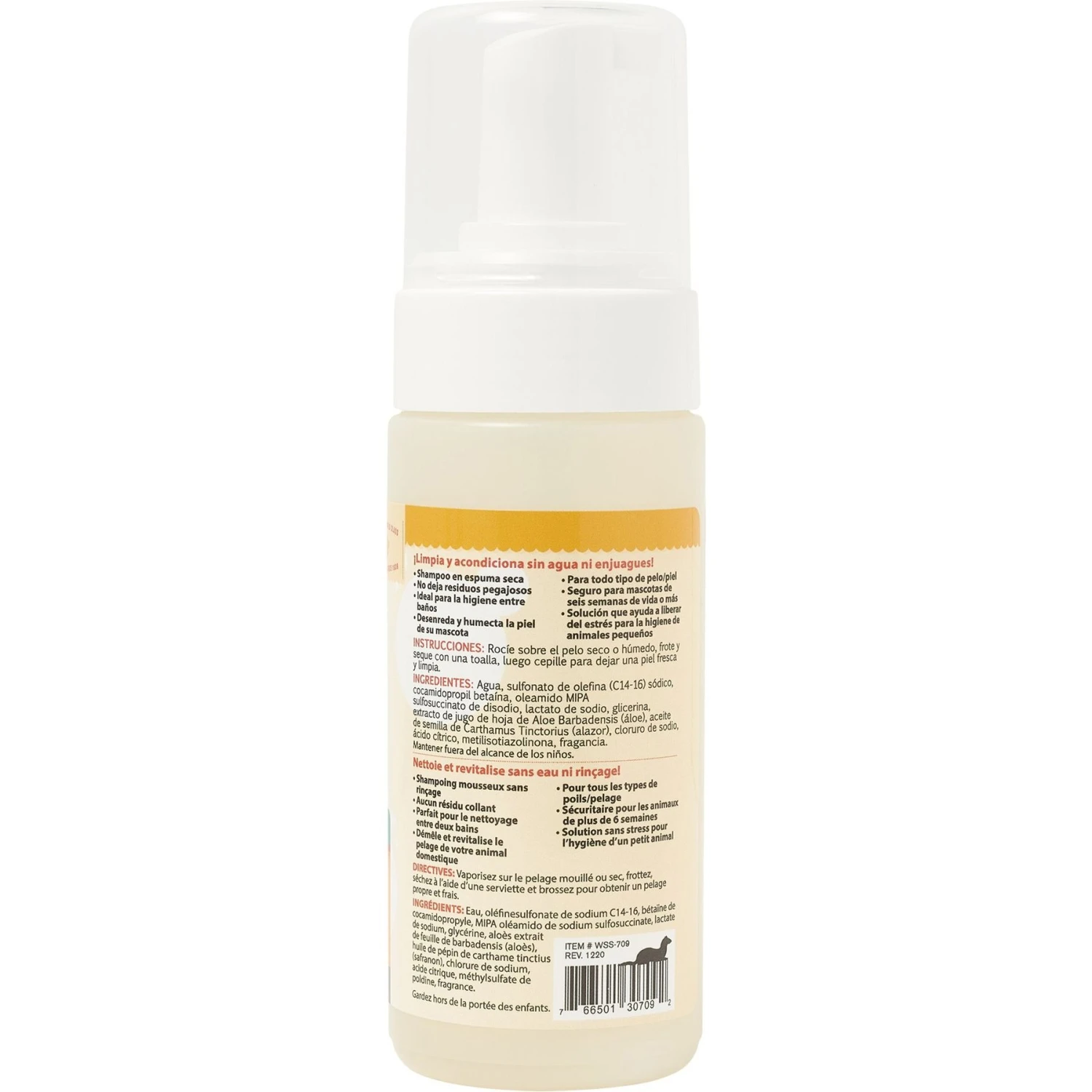 - Leave-in foaming shampoo cleans and conditions without water or rinsing