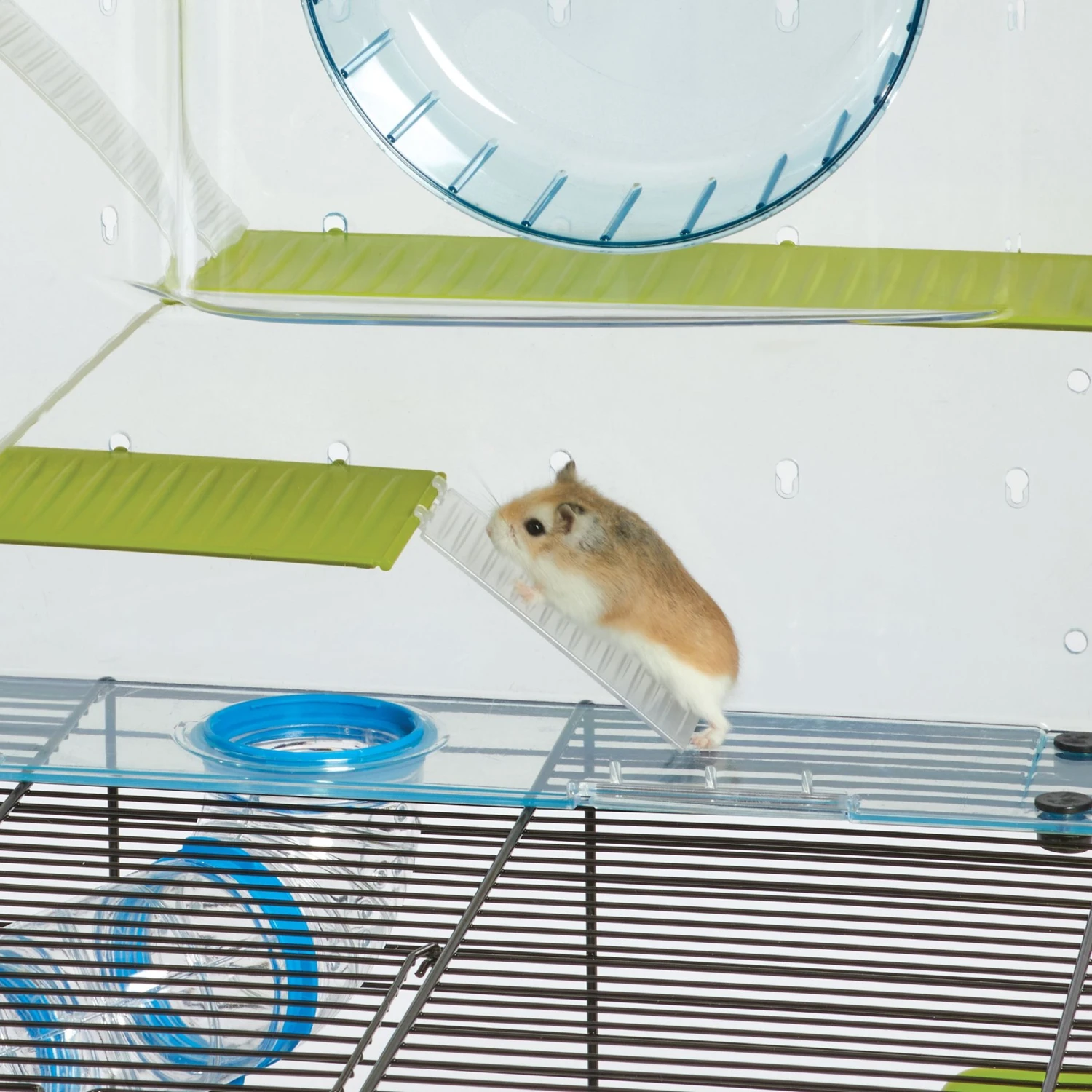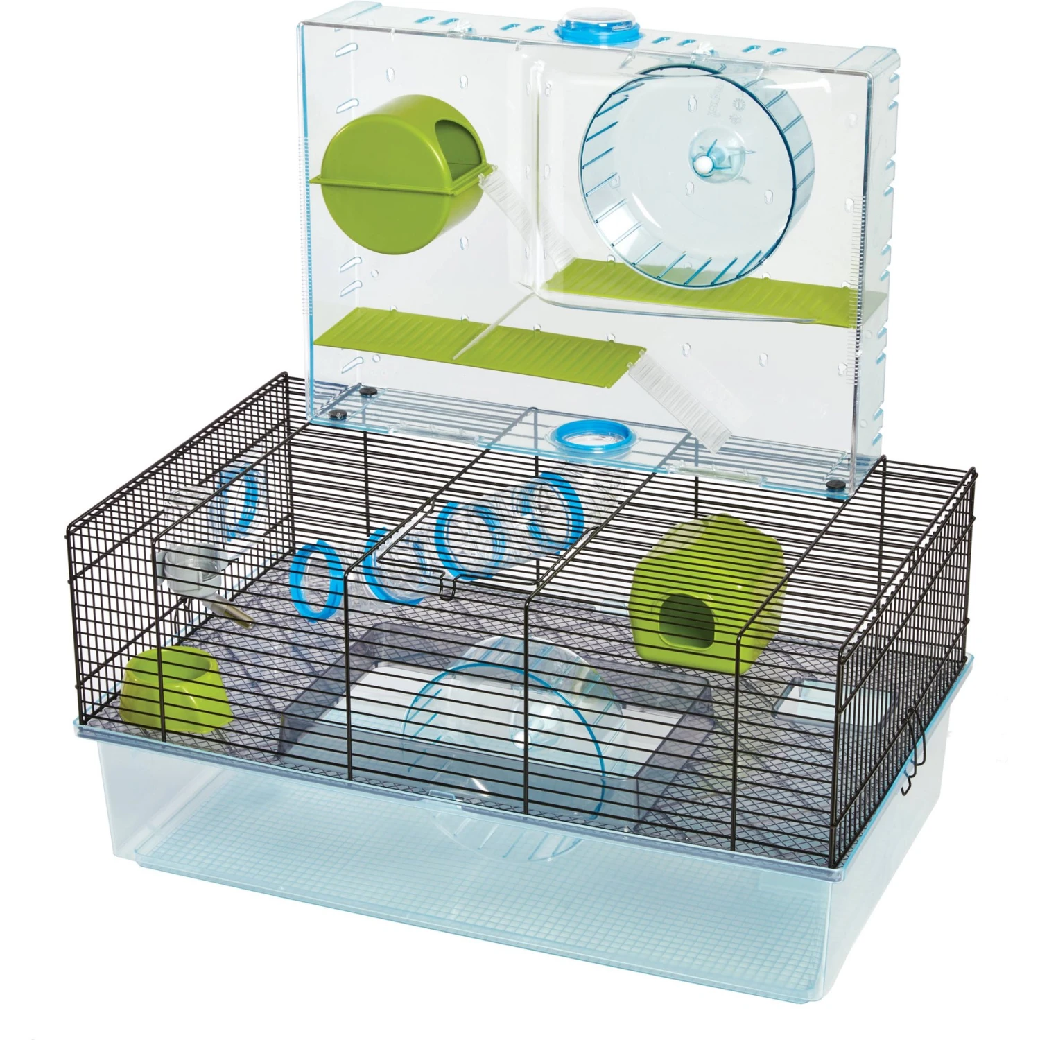 - Includes a food dish, hamster water bottle, hamster hide-out, large exercise wheel and port windows.