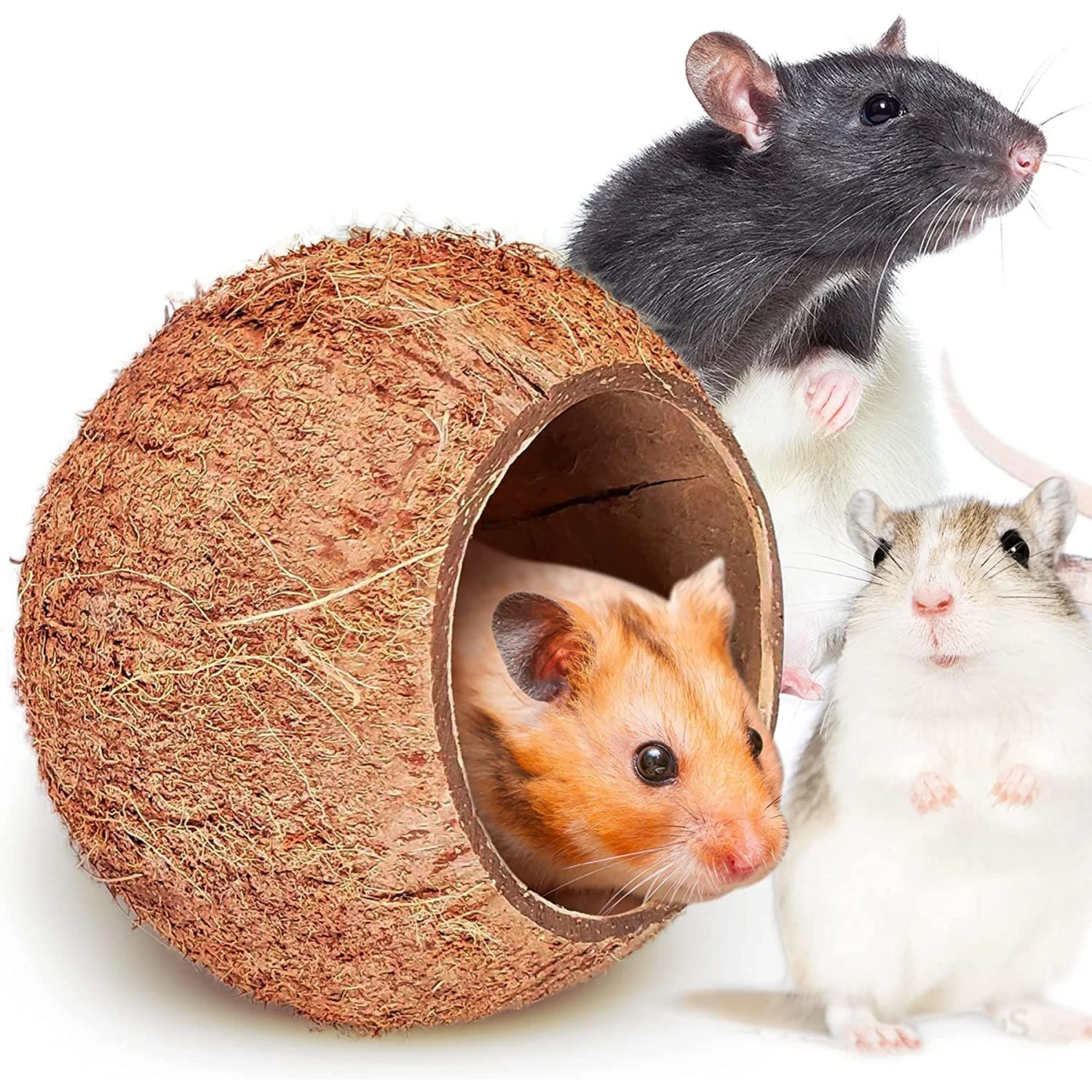 SunGrow Bedding & Sand Bath Container Cozy Hideout Coconut Hut Small-Pet Litter Box