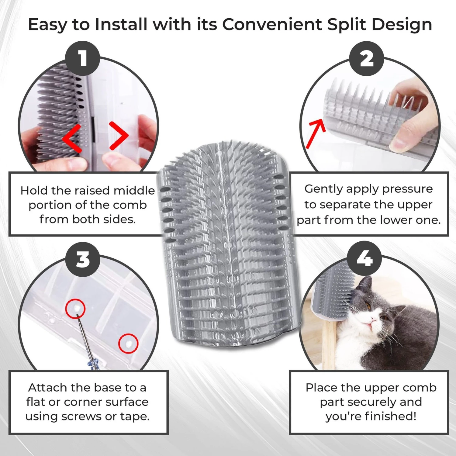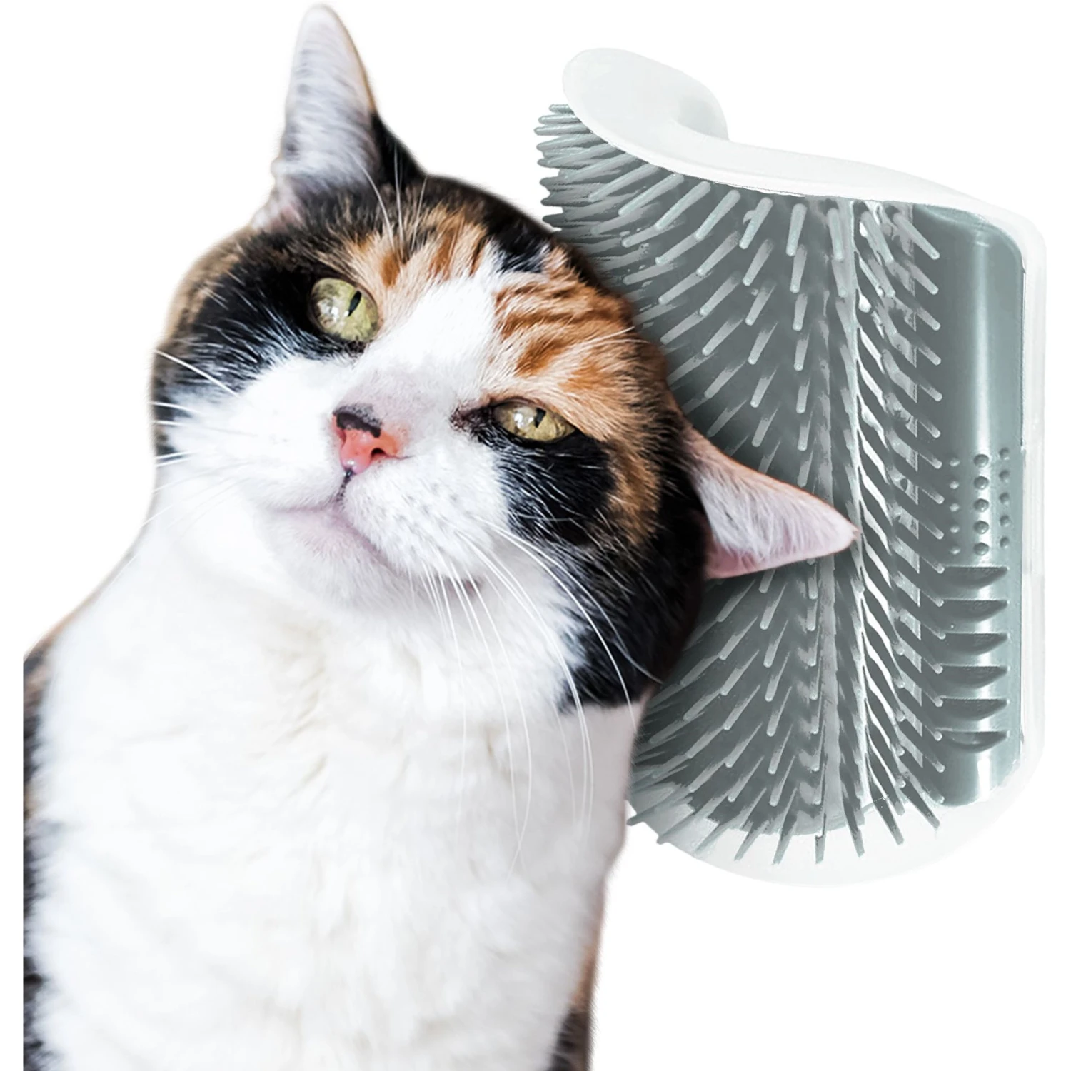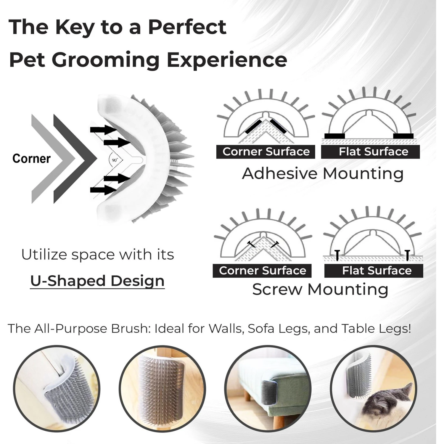 - Designed to easily attach to the outside corner of your wall or furniture, your fur-iend can gently remove dirt and loose fur, or brush, scratch and groom his own shiny coat.