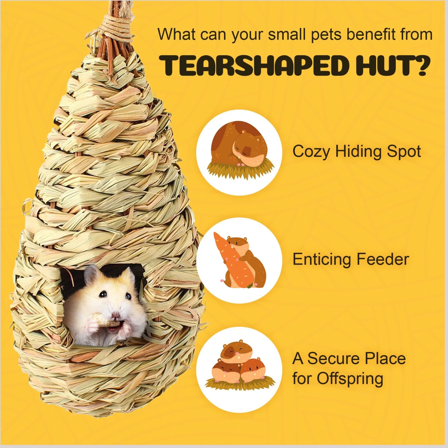 Give your furry friend a special home of his own with SunGrow Tearshaped Hut Rat Hideout! This cozy little hideaway has a paw-fectly sized rectangular opening so your rat or other small friends can enter to snooze or simply relax. Its unique, tear-shaped design makes it an interesting accent to your furbaby’s enclosure. It is handmade from raw fibers, making it a natural addition to your pal’s home. He can use it to stay warm during colder months, or he can use it as a feeder if it is flipped upside down. Simply place it in his enclosure and watch him enjoy its many comforts!
