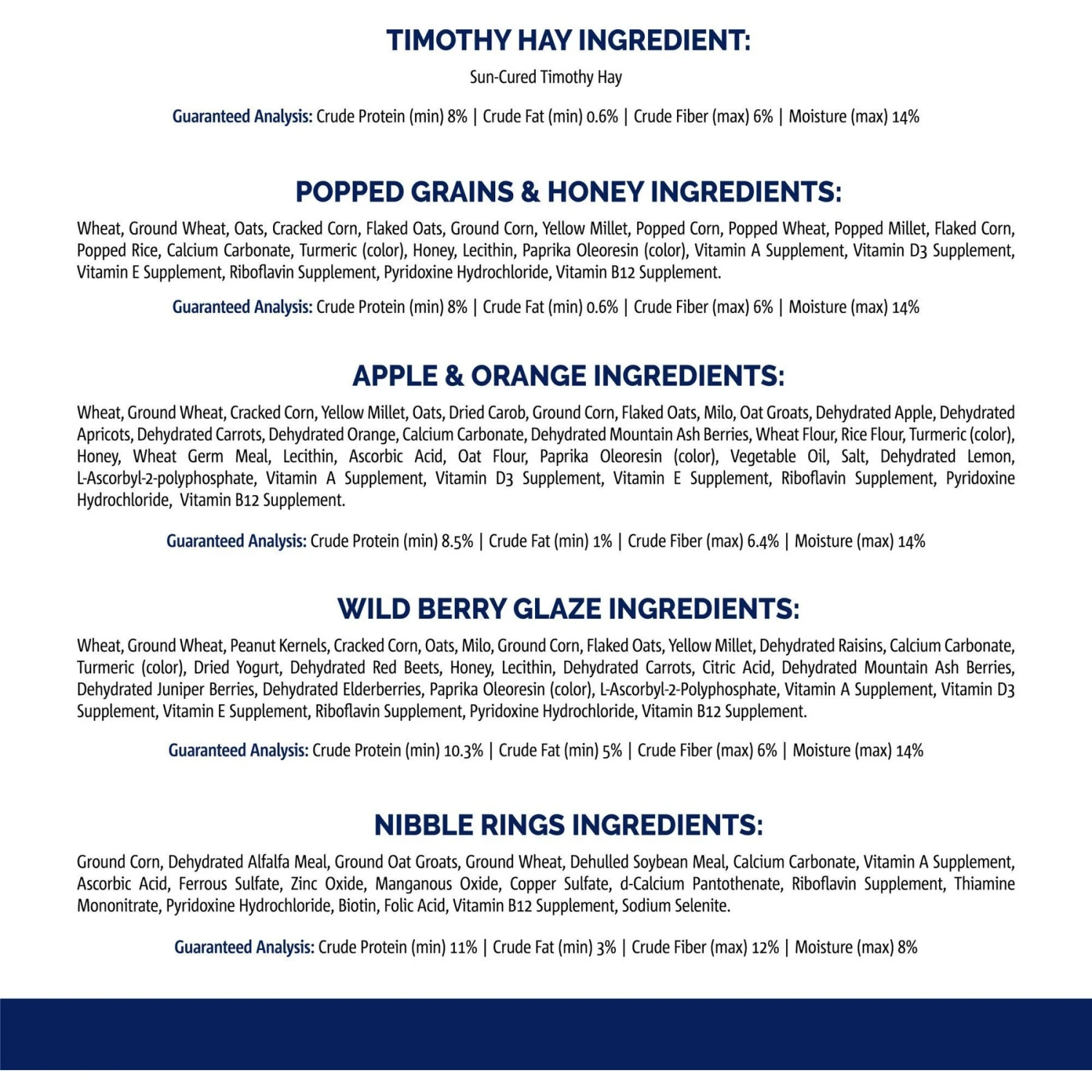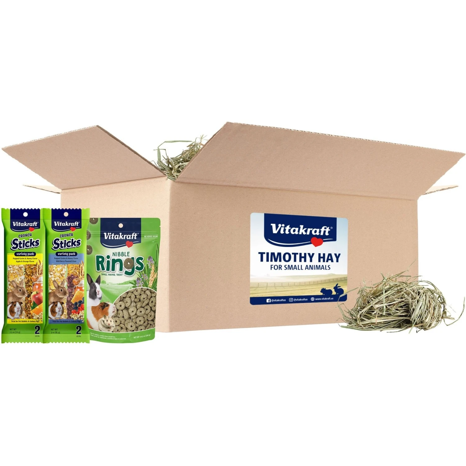 - Special bundle features 100% natural timothy hay that’s sun cured, farm grown and contains no pesticides or preservatives—plus, delicious Crunch Sticks and Nibble Rings!