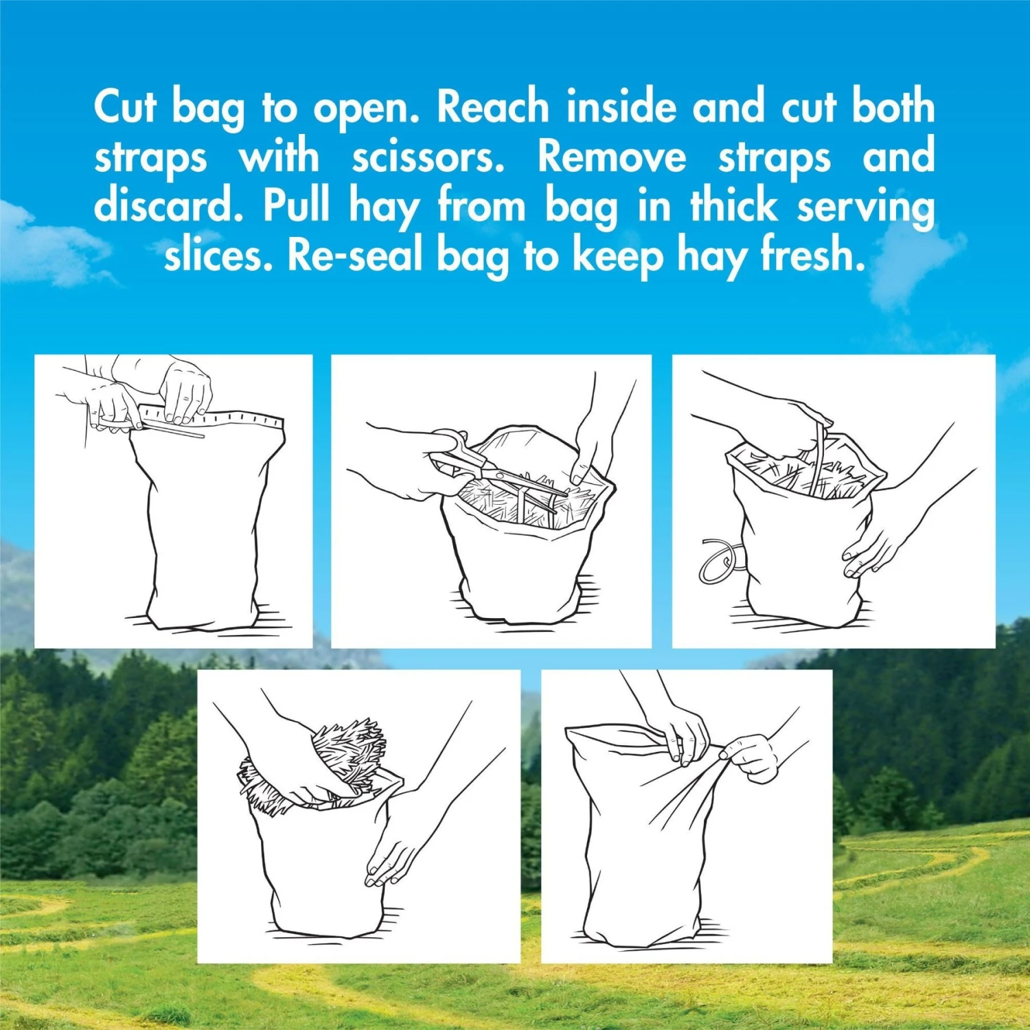 - Hay is hand-harvested at peak maturity for the best nutrient content and stem quality—then, it’s compressed and banded to protect from UV light, helping it stay fresh and flavorful.