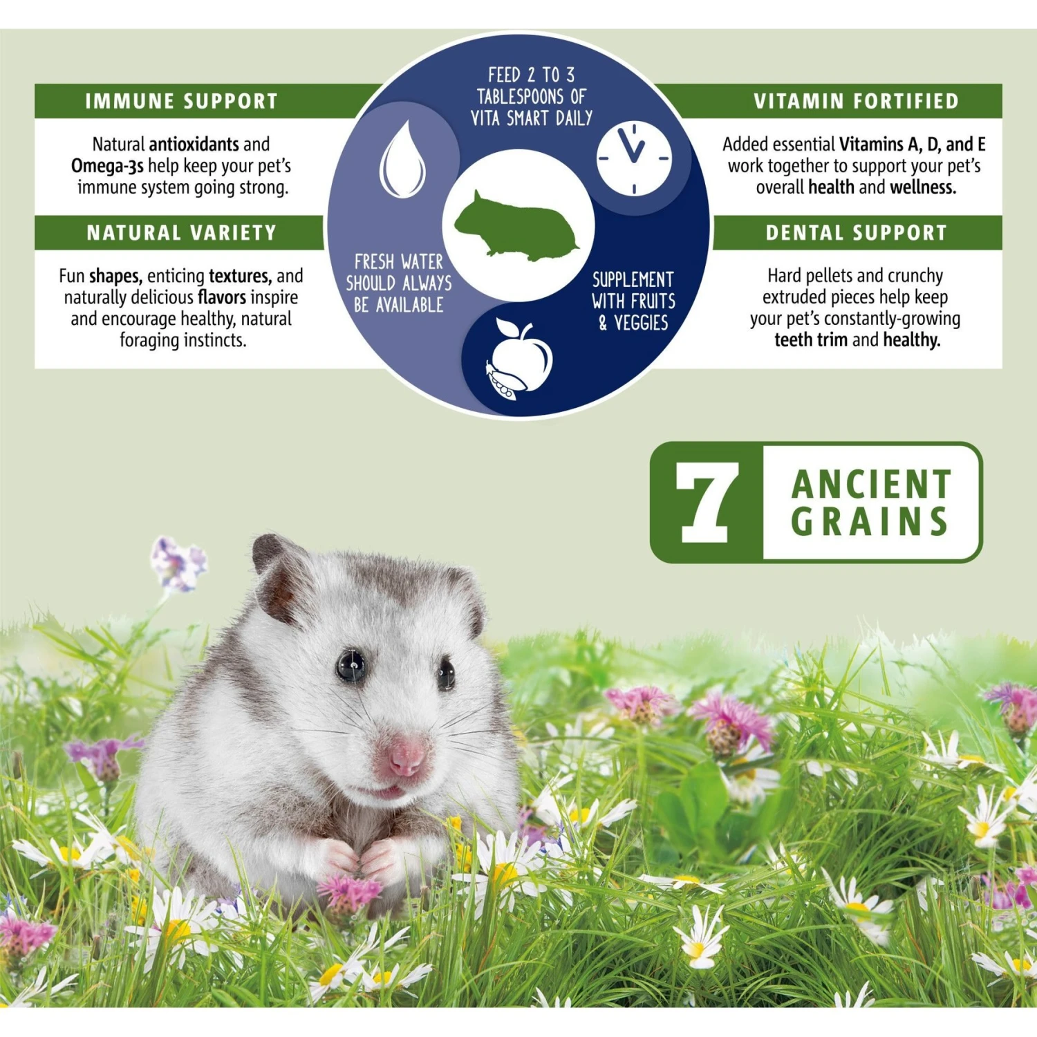 - Curated blend of alfalfa hay hamster pellets, fruits, veggies and 7 nutrient-rich ancient grains.