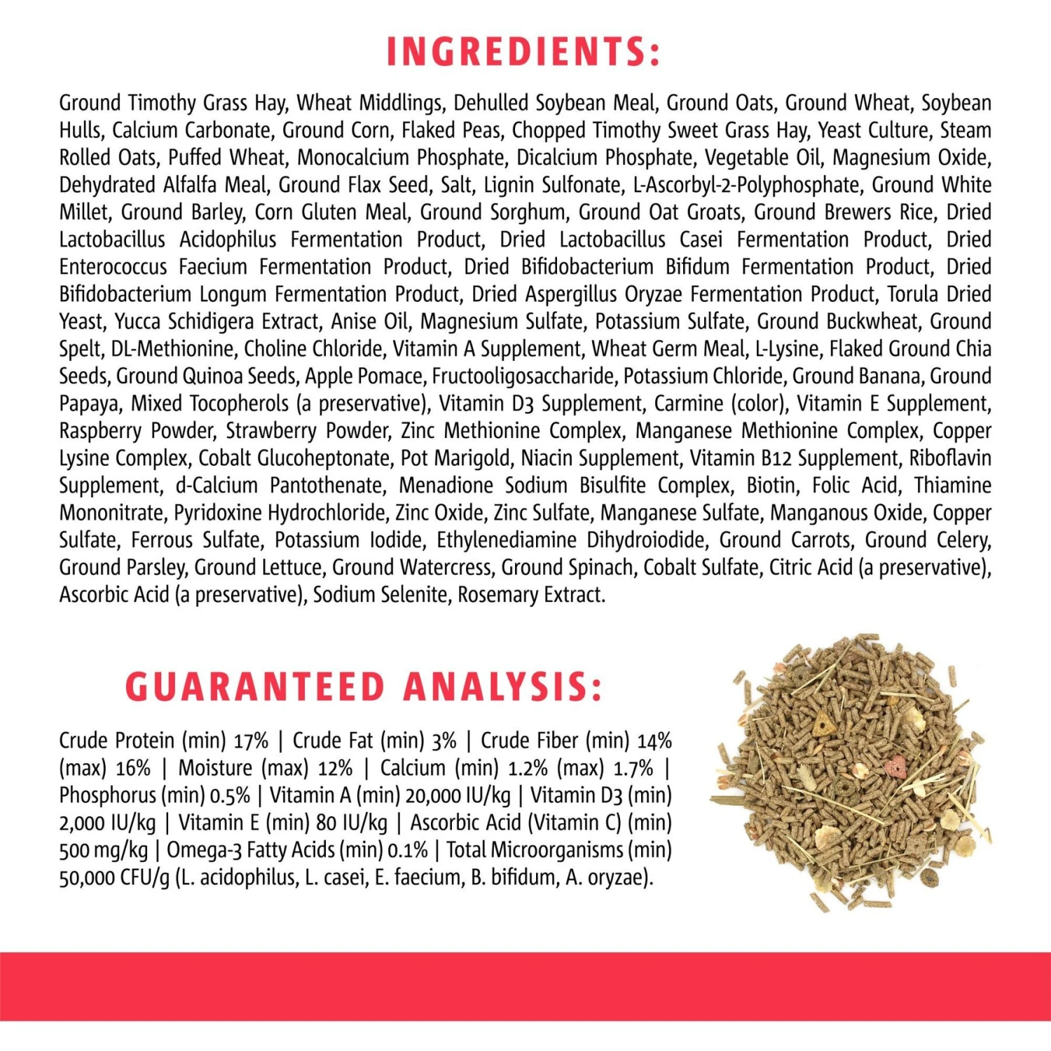 - Made with high-fiber timothy hay that’s chopped and mixed into alfalfa pellets for maximum hay and textured yumminess!
