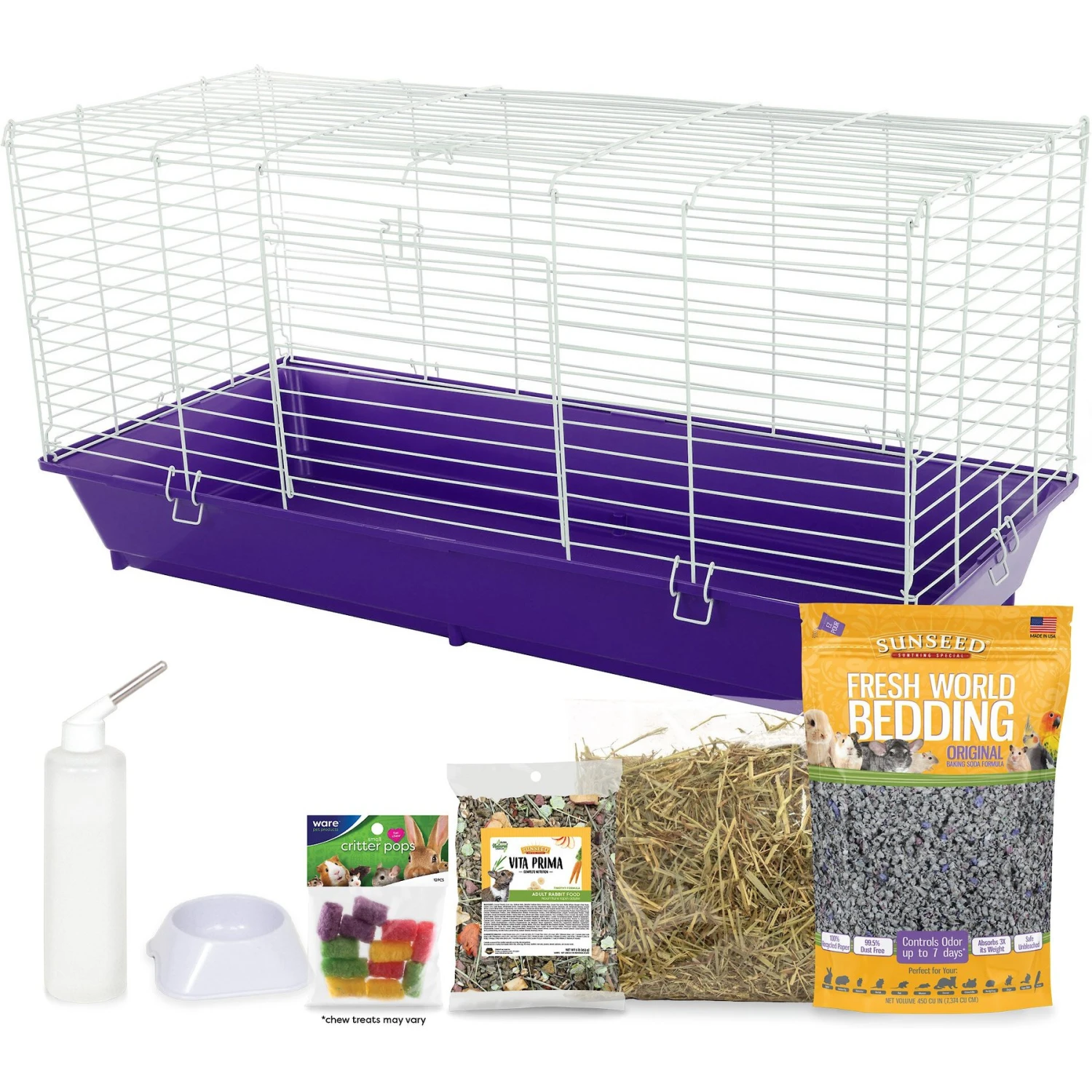 - Comes complete with bedding, a bottle, bowl, cage, a chew toy, food and a toy so your rabbit can feel right at home.